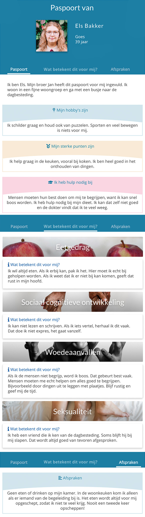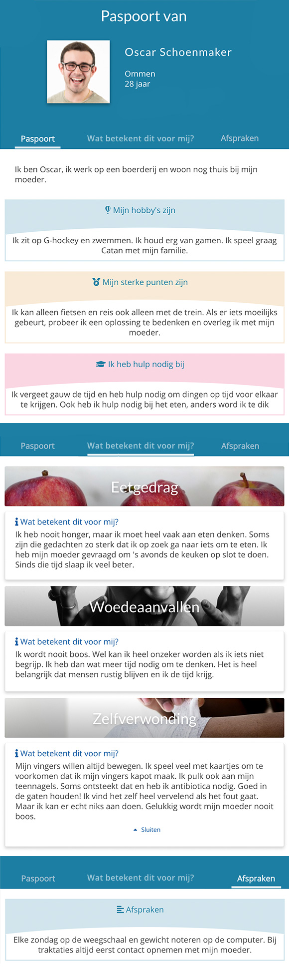 Om op individueel niveau met de toolkit te kunnen werken kun je een paspoort aanmaken. Het voordeel van het aanmaken van een paspoort is dat je de pagina's van de toolkit op maat kunt maken voor de persoon met PWS. Je kunt per onderwerp in de toolkit onderaan de pagina aangeven wat het voor hem betekent om PWS te hebben. Dit komt onder de kop ‘Wat betekent dit voor mij?’ terug in zijn paspoort. Ook kun je aangeven wat zijn sterke kanten zijn, waar hij hulp bij nodig heeft en welke afspraken met hem zijn gemaakt.